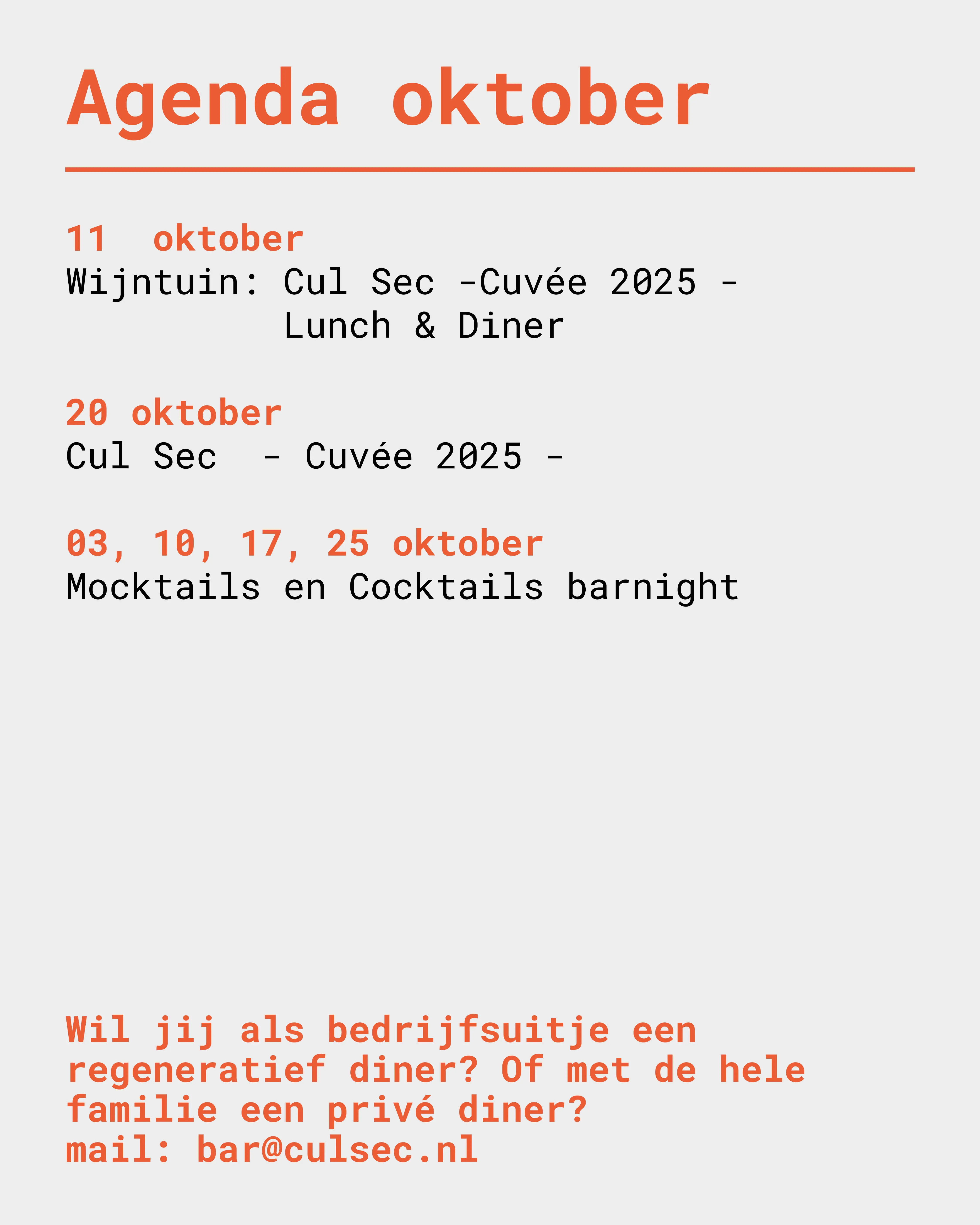 Cul Sec resto is geopend van do - zon (lunch, koffie, borrel en diner). Of schuif aan bij de arbeiderslunch op woe-do (12:30-13:30) Het restaurant binnen en de wijntuin buiten bevindt zich tegenover onze fabriek en aan de rand van de Betuwe, tussen de fruittelers en voedselbossen. Wij serveren een hyper lokaal tasting menu, met natuurwijnen en zelf door Fruitslagers gemaakte non-alcoholische dranken. Kom aanwaaien voor een 0km lunch of daghap met bijvoorbeeld Boonzaak tempeh op een pita. Of kom voor de volledige ervaring: Ons 4-, 5- of 6 gangen menu met bijpassende pairing. Wil je even blijven hangen? Steek het kampvuur aan en drink lokale cider of alcoholvrije (of volle) cocktails. (pin only)