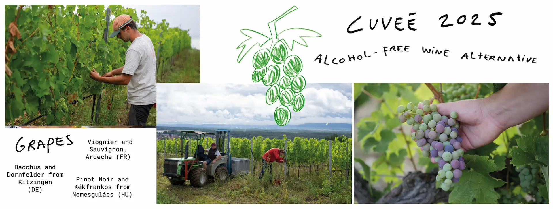 Voor de 2025 cuvée trokken we door Europa op zoek naar de perfecte druif voor alcoholvrij. We vonden florale tonen in Duitsland, frisse zuren in Hongarije en volle, zoete druiven in het zuiden van Frankrijk. Bij de biodynamische boeren die we ontmoetten, ontdekten we ook de frisse zuren in onrijpe druiven. Boeren plukken de onrijpe trossen om ruimte te maken voor zongerijpte trossen vol suikers. Wij maken dankbaar gebruik van wat de wijnmaker in de weg hangt: fris verjus uit jonge druiven. Een natuurlijk zuur wat zich perfect leent voor Cul Sec. In Nederland zijn steeds meer wijngaarden te vinden met daarin misschien wel de perfecte druif voor alcoholvrije wijn. In deze cuvée vind je ze al terug en we dromen ervan met Cul Sec de Nederlandse biologische druiventeelt te vergroten.